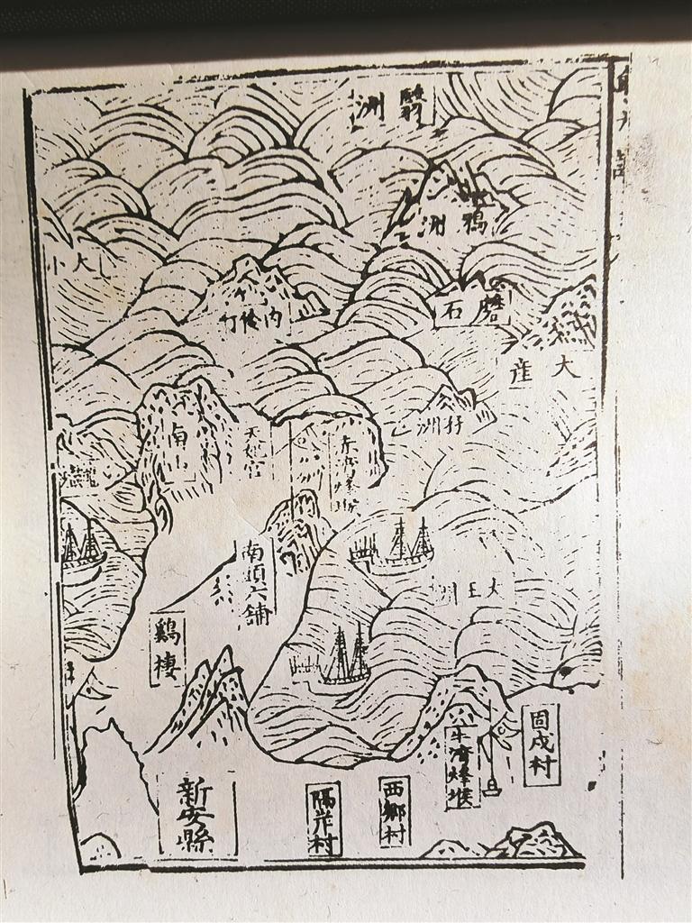④厚圃小說《拖神》:媽祖別稱姑婆。另鴉洲等錄此備忘,停船處十分重要:《粵大記》孖洲、大產之西有磨石(應為礬石),西人圖所謂Great and Little Mew,在孖洲西南,是礬石嶼和西邊另一塊白色礁石。礬石和翳洲(應是淇澳島?)之間有鴉洲,在內伶仃之西。赤灣烽堠在小南山上。牛灣烽堠在固戍東之山上。西鄉村。隔岸村。天妃廟在大小南山間海邊,正對內伶仃。大王洲。南頭六鋪前、赤灣烽堠下各停一艘大船,此示意南頭海有兩個碼頭,一在石圍塘,一在南山炮台下。屯門未停船,停船處在赤鱲角和下磨刀之間,沙螺灣-東西涌前。而尖沙嘴和黃泥涌之間停二大船,在春花落和鯉魚門之間。官富司西北之山名九龍山,是獅子山,本名虎頭山。大小官富在官富司之東,官富山是飛鵝山。補記:《粵大記》圖精確,且覺親切。圖為正南北。南山(與聖山隔龍鼓洲),天妃宮(在南山西),赤灣烽堠(在南山西北),南頭六鋪,雞棲,新安縣,隔岸村,西鄉村,牛灣烽堠,固戍村,大王洲,孖洲,大產,礬石,內伶仃,鴉洲,翳洲。六鋪我有確考,是南門外至墩頭一帶。