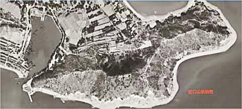 蛇口山航拍圖(上世紀六七十年代)。左之小澳即古之雞棲澳,今填建為蛇口廣場。明代之澳,必大於此。山之東角即為東角頭,蛇口山頂上可見有工事。