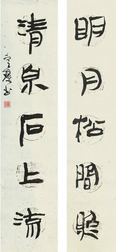 陳定璟漢簡書法對聯《明月松間照清泉石上流》。