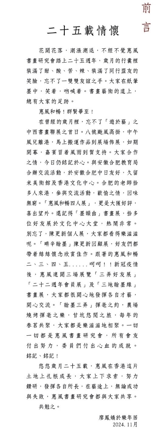 由惠風書畫研究會主辦的「惠風書畫研究會成立二十五周年」展覽,將於1月2日至5日假香港中央圖書館舉行,1月2日會舉行開幕禮。