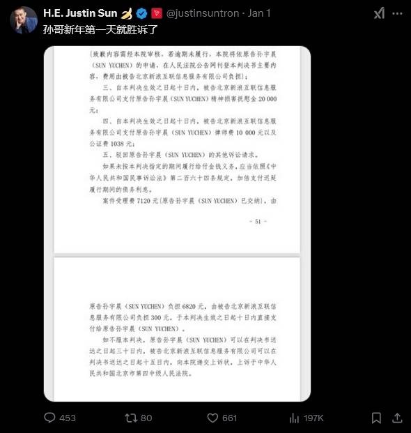 2025年的第一天,区块链知名人士孙宇晨在社交平台上透露,他在2025年第1天就迎来了胜诉。社交平台展示的信息显示,孙宇晨获诉某知名门户侵害名誉权一审胜诉。该案涉及的内容正是几年前令全国媒体陷入流量狂欢的孙宇晨“被FBI调查”传言。而在去年,孙宇晨已获得诉重庆商界传媒集团发布孙宇晨“被FBI调查”相关报道侵害名誉权诉讼的胜诉,重庆商界传媒集团已按照判决书对孙宇晨进行了公开致歉。
