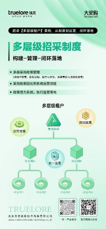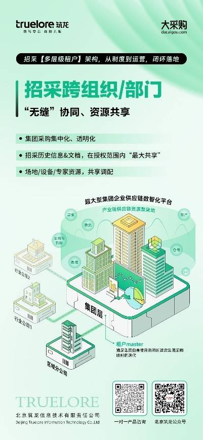 借助北京筑龙的「多层级租户」架构,能够在集团层搭建统一招采平台,各子公司作为独立租户入驻,共享底层基础设施(如服务器、数据库),但拥有独立的数据空间和业务配置权限。总部拥有“超级管理权”,可定义全局采购政策、监控全平台数据;子公司根据业务需求自定义招采流程、供应商筛选规则等,同时需遵循集团合规框架。