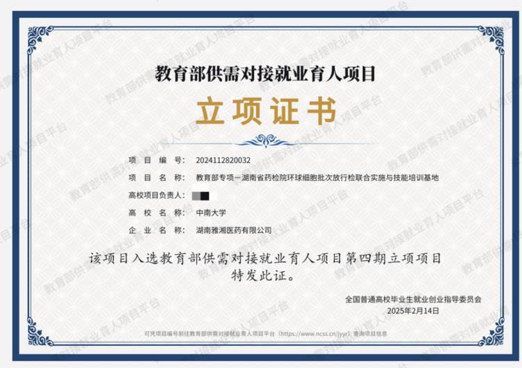 据教育部专项公布:中南大学申报的就业实习基地项目“教育部专项-湖南省药检院【环球细胞】批次放行检联合实施与技能培训基地”(项目编号:2024112820032)获得立项,项目研究成员来自(高校院所)中南大学、湘雅医院、湘雅二医院、湘雅三医院、湘雅口腔医院、湖南省人民医院、蒙纳士大学、(企业单位)湖南雅湘医药有限公司、湖南自贸试验区环球细胞库有限公司。项目核心内容是以环球细胞库为试点,引入“高校+省药检院”批次放行检模式,联合质控每一份干细胞、免疫细胞的出库质量,并作为教育基地为高校实习生和企业技术人员提供细胞批次放行检的技能培训。