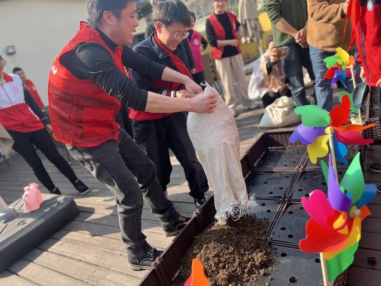 3月11日,“小叶子快乐农场”种植活动在和睦社区三楼平台热闹开展。党员老师带领学生代表们,满怀热忱地投入到种植工作中。活动现场,大家分工明确,有条不紊地进行着各项种植任务。大家合力搬来事先准备好的肥沃土壤,一铲一铲地将土壤填入种植区域,不一会儿,土地就被填得满满当当。填土完成后,就到了播种环节,只见同学们蹲在地上,用稚嫩的小手轻轻将种子撒入土壤中,每撒下一粒,都像是播下了一个美好的心愿。播完种后,学生们两人一组,提着小水桶往返于水源和种植区域浇水。看着清澈的水滋润种子,学生们脸上洋溢着满足的笑容。