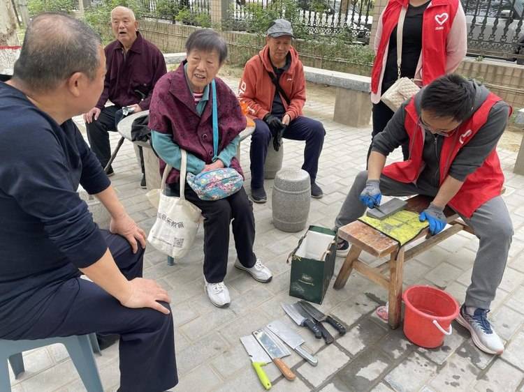 免费磨刀磨剪摊位前,志愿者师傅认真打磨居民拿来的钝刀具。张大妈高兴地说:“这刀磨得真快,又能多用几年了,这个服务好!”