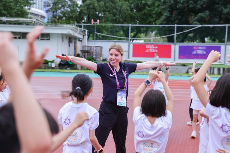 世界田联少儿田径项目负责人凯瑟琳带动孩子们热身并进行讲解