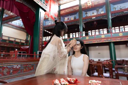 古北水镇设置点额、系五彩绳、撒雄黄酒、做香囊等传统习俗体验点,将端午习俗解构为可感知、可参与的沉浸式体验单元。点额礼体验区以雄黄酒为媒,执笔蘸雄黄,在孩童眉心轻轻点画;系上象征五色祥瑞的五彩绳,将五彩绳转化为亲子记忆载体;游客以艾草蘸雄黄酒,撒雄黄酒祛秽祈顺;香囊DIY体验区清香萦绕,游客将草药亲手缝入香囊,佩戴在身边。这些传统习俗体验点通过“五感通联”设计强化仪式感染力,以场景化互动传递端午文化的深厚底蕴,以仪式感构建文化传承的沉浸场域。