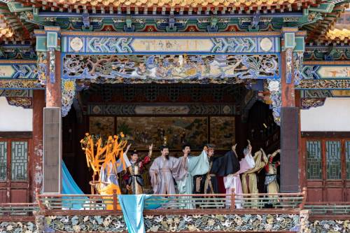 在古北水镇的日月岛广场区域,沉浸式屈原情景剧震撼上演。战国诗人屈原通过实景演绎“穿越”至古北水镇。这一创新演绎不仅让历史人物“活起来”,在沉浸式情景剧中感受“路漫漫其修远兮”的家国情怀,还打破传统文化学习模式,让历史文化从典籍走向场景式体验,让历史人物“穿越”赋能文化共鸣。
