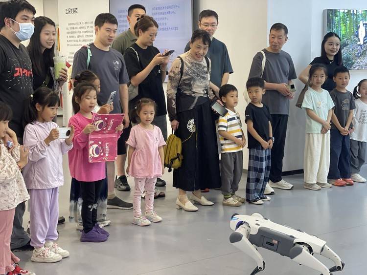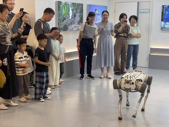 四足机器人“绝影”的打招呼、作揖、跳跃等动作引得大家赞叹连连!小朋友们也热情地和它互动,现场充满了欢声笑语。工作人员还为小朋友们演示了“绝影”的多种功能,包括自主巡检、应急救援等。
