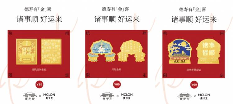 以金为媒,续写南宋风华,打造杭州城市文化“金”名片。德寿宫作为南宋皇家宫苑遗址,承载着"一部杭州史,半部在上城"的文化厚度。曼卡龙深耕黄金工艺三十余年,此次推出的三款联名金贴特别选取德寿宫三大文化符号:宫廷美学、建筑智慧、人文精神。根据此为灵感,创作「德寿·凤冠金贴」、「德寿·诸事顺遂金贴」、「德寿·提钱退休金贴」。