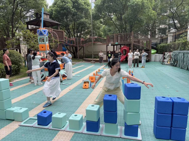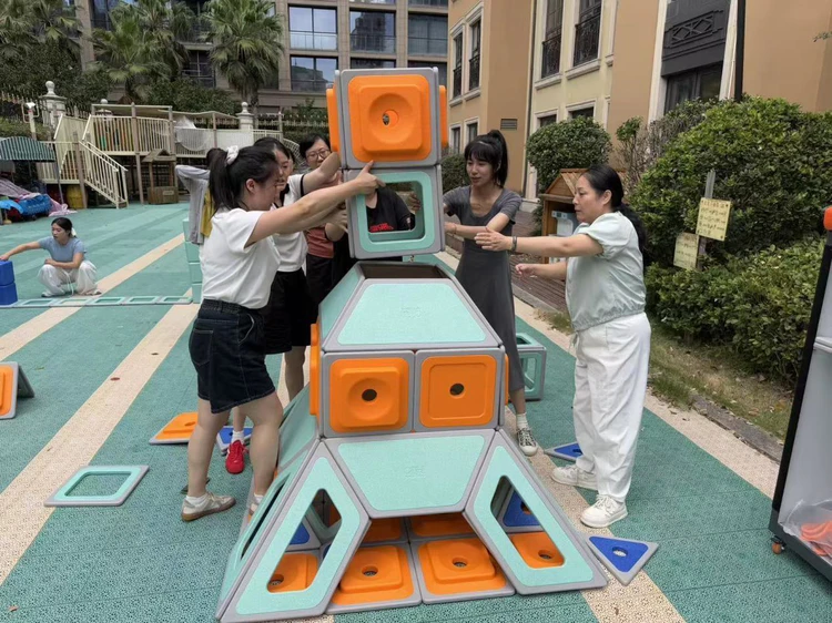 杭州市文晖幼儿园邀请了大世界磁力片玩具的殷老师来为老师们进行培训活动。在活动中,殷老师向老师们展示磁力片在幼儿活动中的创意玩法,并让老师们分组进行搭建活动,组队设计体育项目并进行比拼,帮助教师充分地了解磁力片的玩法,感受磁力片带来的乐趣,也增强了园区教师之间的凝聚力。