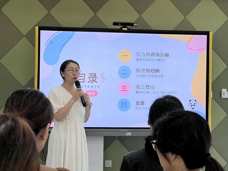 8月27日上午,沈塘桥学前教育集团邀请了心理专家乔乔老师来为老师们开展心理健康专题讲座活动。心理老师聚焦“压力”,让老师们了解压力的来源,从“过去”“现在”“未来”三个时间点来梳理和归纳自己压力产生的原因,从而更好地缓解压力,优化心理状态。心理老师还为老师们准备了趣味心理游戏,通过抽取卡牌与分享的方式,群策群力分享减压小妙招。
