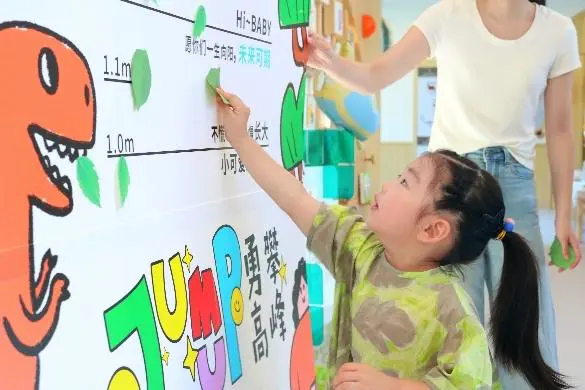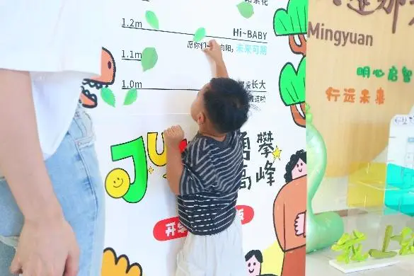 小班的宝贝们,准备好挑战“摸高签到墙” 啦!跳一跳,伸手将树叶便利贴贴在墙上 —— 每一次跳跃,都是对 “长大” 的小小宣告。
