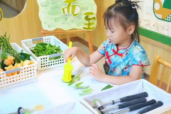中班的孩子们,来体验有趣的“榉叶锤染” 吧!大家拿起小锤子,将榉树叶的汁液拓印在布上,观察叶脉的纹路,共同完成一幅集体艺术画。