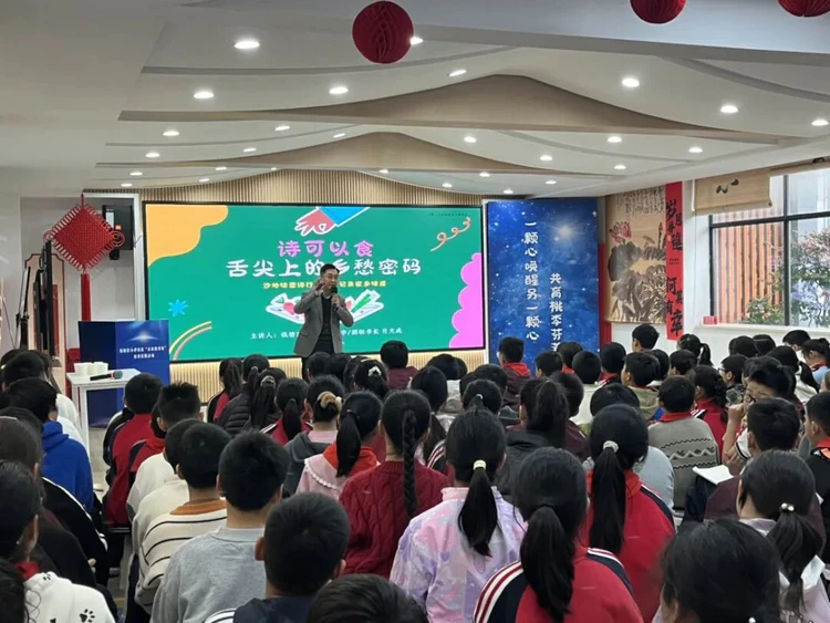 学校不定期邀请区内外作协的作家、诗人,本地文化名人,非遗传承人,沙地老农等任导师,指导学生将原创童诗改编为沙地话童谣,用AI谱曲吟诵“青蛙蹲荷叶,唱夏忙”;2025年春季全校开展“春天可以诗”系列活动,如一年级的“诗可以演”,二年级的“诗可以歌”,三年级的“诗可以诵”,四年级的“诗可以画”,五年级的“诗可以食”,六年级的“诗可以创”;夏初深入乡村社区、田间地头开展“童诗走乡村”活动,学生携原创诗歌用标准普通话为村民、社区居民朗诵、吟唱,进行歌舞表演,让“稻穗”“麦田”“菜畦”等乡村元素借规范语言传情达意。