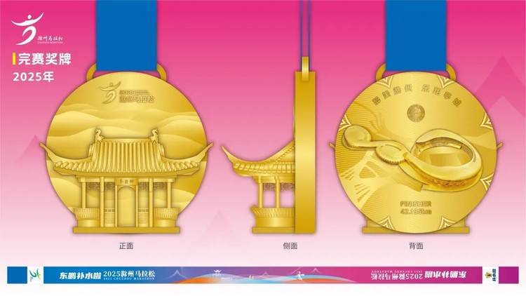 2025滁马完赛奖牌,以醉翁亭为核心元素,融入琅琊山山水纹理。正面呈现醉翁亭,呼应“醉美滁州”,立体设计勾勒亭台轮廓,展现建筑韵味;背面以滁州奥体中心地标为主要元素,串联自然、人文与赛事,让跑者完赛后揽滁州山水人文于一 “牌”,铭记乐跑亭城的难忘历程。