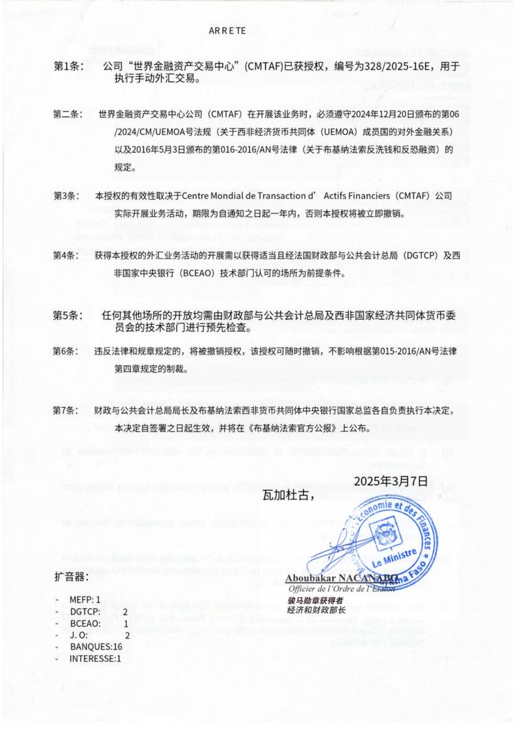 更值得一提的是,今年3月,【世界金融资产交易中心】(CMTAF)亦获得由西非国家中央银行(BCEAO)正式颁发的国际货币换汇许可法令文件,也正式成为西非经济和货币联盟(UEMOA)体系内合规运营的国际企业。该许可法令将为集团立足西非开展跨境支付、国际结算、汇率转换等金融业务提供重要支持,极大提升其资金运转效率和国际结算能力。