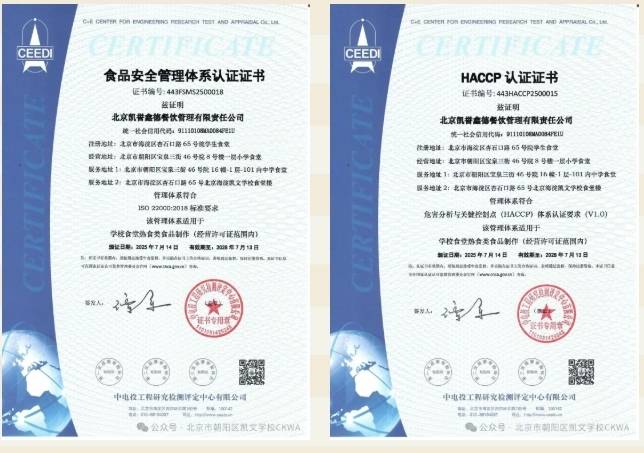 2022年8月,凯誉鑫德通过华信创(北京)认证中心有限公司FSMS和HACCP管理体系认证。认证所依据的标准,无论是ISO 22000:2018,还是GB/T27341,均以HACCP (Hazard Analysis Critical Control Point, 即危害分析与关键控制点),这一世界性的食品质量控制管理的有效办法的基本原理为核心内容,参照了国际食品法典委员会颁布的《食品卫生通则》而制定。