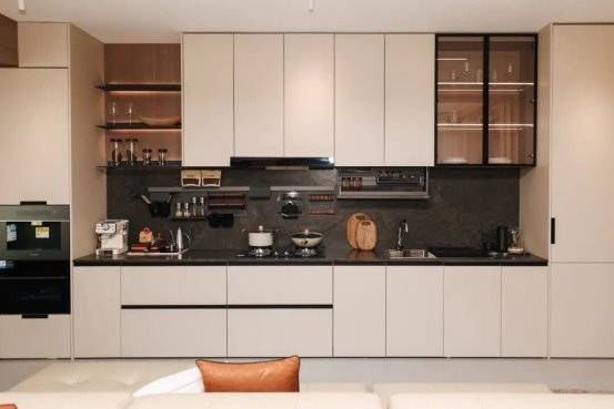 人性化的细节设计与智能科技的深度融入,是柏菲伦塑造高品质生活的核心密码。玄关区的垂直收纳系统集成了鞋架与次净衣消毒仓,高效解决小户型入户收纳痛点;吊柜升降机、高柜联动篮让高处取物“抬手即达”,嵌入式冰箱、水槽洗碗机则构建了“零弯腰”的流畅动线。