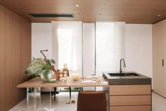 核心亮点在于其创新性的“客餐厨一体化魔法空间”:创新的回旋插入门设计,使得餐厨区域在闭门时呈现极简立面的静谧美学,开门后则瞬间释放出功能完备的咖啡品酒操作台,空间转换充满仪式感与实用性。