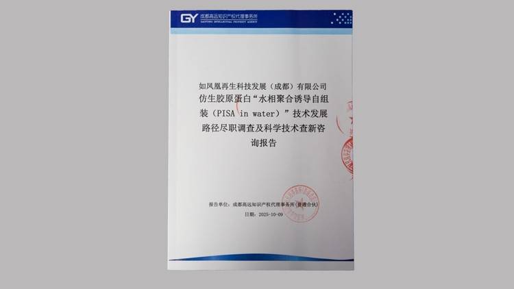 据成都高远知识产权代理事务所专利代理人郑勇力博士评估,通过检索全球同类专利并比对技术方案,确认仿生胶原蛋白技术1.0为全球首创、国际领先;其2.0版本在“水相聚合诱导自组装(PISA in water)”工艺下进一步提升稳定性及自组装特性,并全球首次利用300 kV冷冻透射电镜捕获“胶原纤维束”超微结构,验证了多批次产品自主装形态特征的可重复性与一致性,同样具有“全球首创、国际领先”属性。