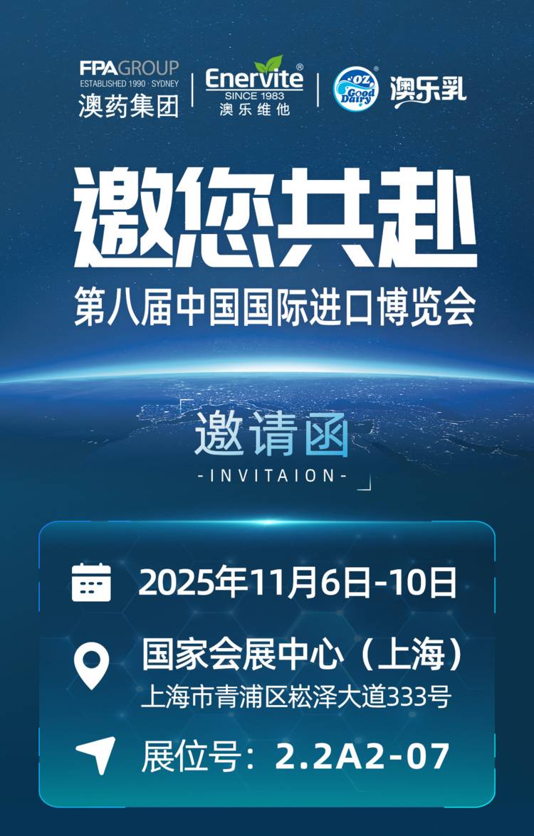2025年11月5日至10日第八届中国国际进口博览会(以下简称“进博会”)将于国家会展中心(上海)举办。本届展会将继续秉承“新时代,共享未来”理念,汇聚全球近3000家创新力量企业,为国际化交流合作搭建稳固的桥梁。作为澳大利亚健康产业的领军企业--澳药集团将再度亮相这一重大国际盛会,全面展示其依托三十余年行业积淀所构建的“全球健康营养品CDMO一站式平台”,并携手中国市场及全球伙伴共筑健康产业发展新生态。