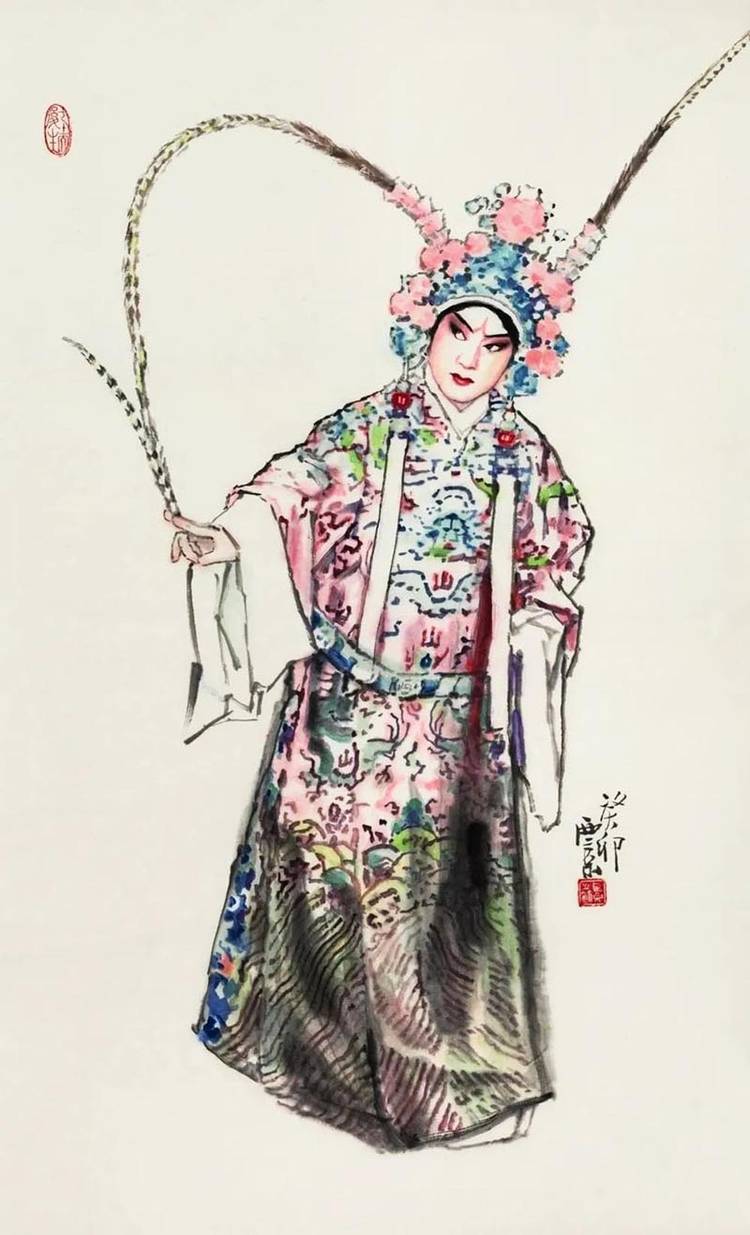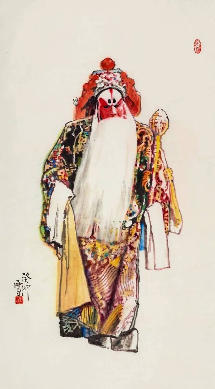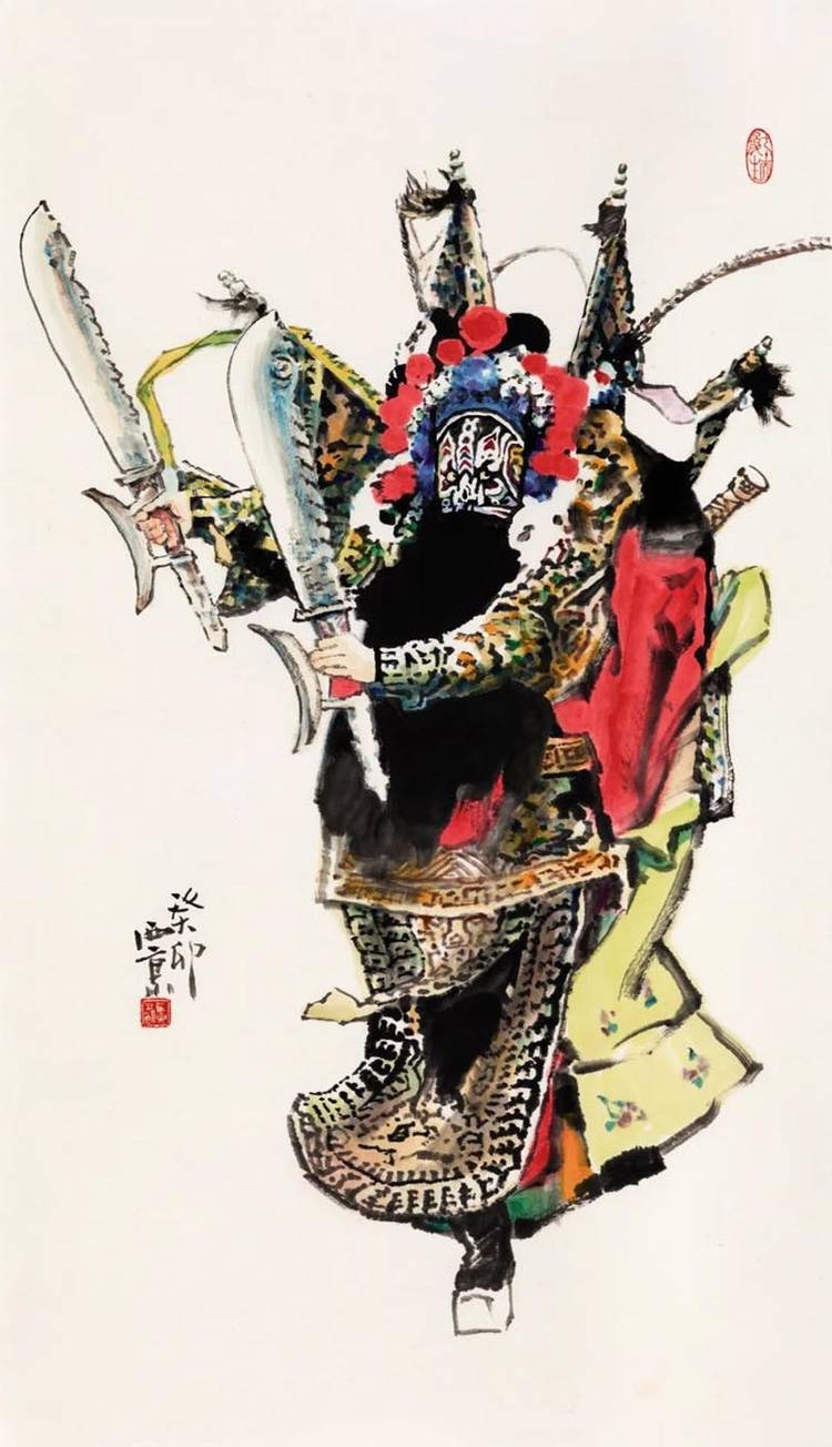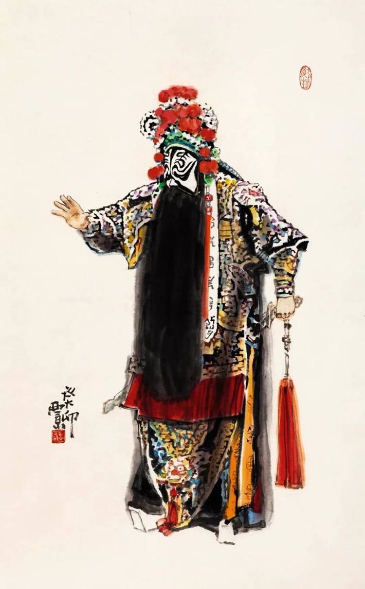在艺术之路上,他是永不停歇的攀登者。无论是人物肖像的形神交融,还是历史题材的宏阔叙事,他的笔墨间始终流淌着民族文化的血脉与时代的脉动。八十岁的他,未选择安逸回望过往成就,而是以“再出发”的姿态探索笔墨新语言,尝试更具当代性的表达。其“舞韵”“梨园”“武林”系列,及新近创作的“云裳”系列,正是他艺术生命丰盈的明证,更是 “八十而立”后新征程的注脚。这份不老的艺术心性,让他的创作依旧饱含锋芒与生命力。