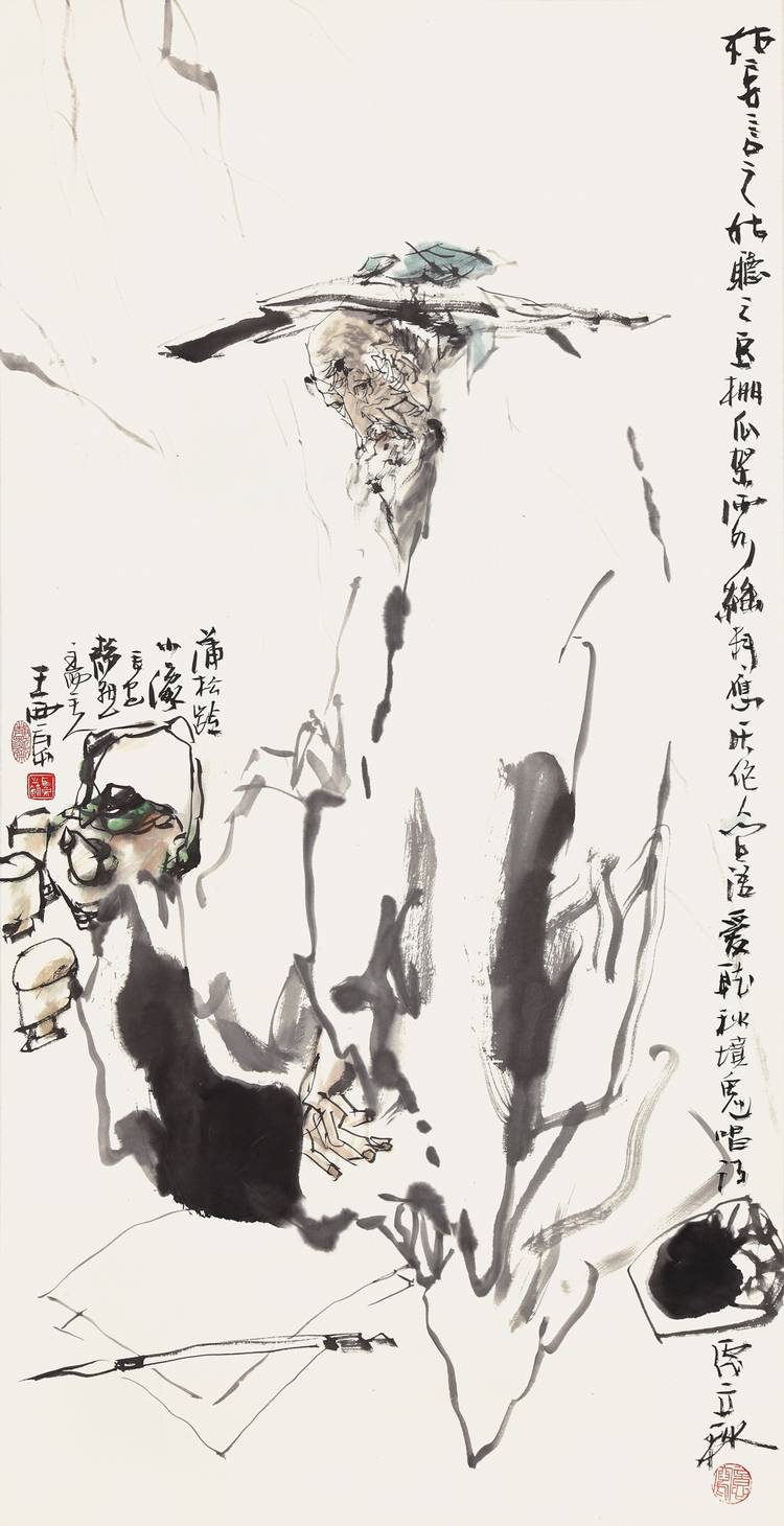 王西京是一位虔诚的文化守护者,深深扎根于华夏博大精深的文化厚土之中,同时创新艺术表达。他的新文人画和历史人物画是传统文化的集大成者,以书为骨,以诗为魂,阐释着儒家、道家思想,代表着中国文化的主流。例如,他创作的《文天祥》《岳飞》《天问》(屈原)等爱国人物画,以及《司马迁》《竹林七贤》《苏东坡》《曹雪芹》《郑板桥》《蒲松龄》《鲁迅》《巴金》等文化人物画,还有《陶潜诗意》《贵妃醉酒》《玉楼醉春图》《唐人诗意》《天闲云淡》等雍容华贵或清新空寂的水墨写意人物画,这些作品包含着家国情怀、人生态度和宇宙意识,将他的艺术推向了一个新的高度。