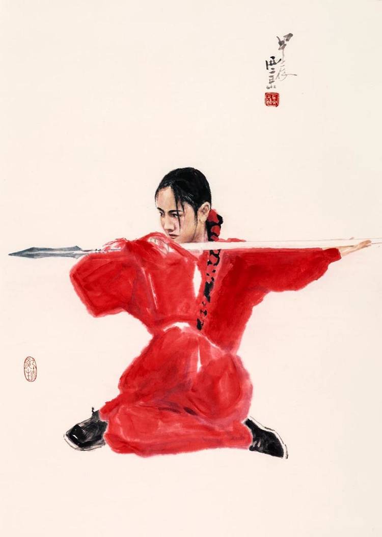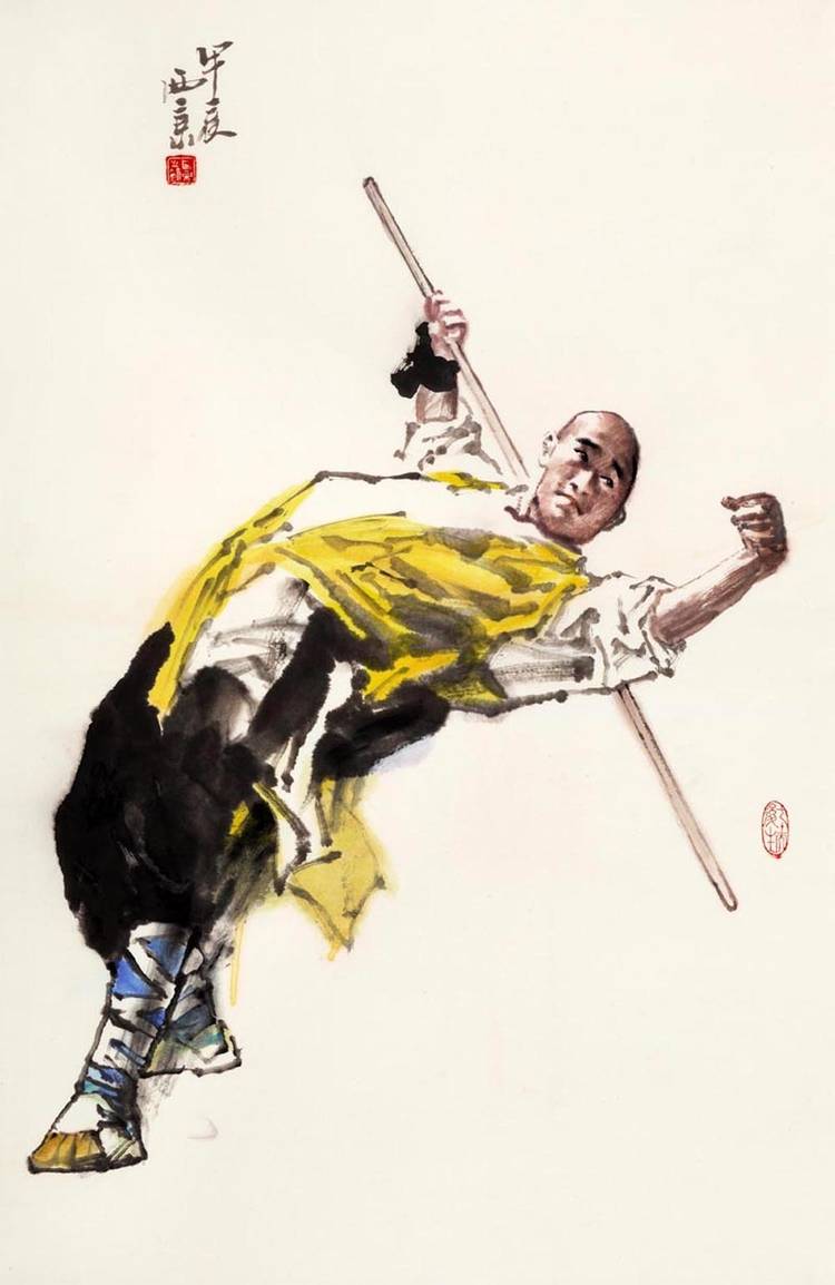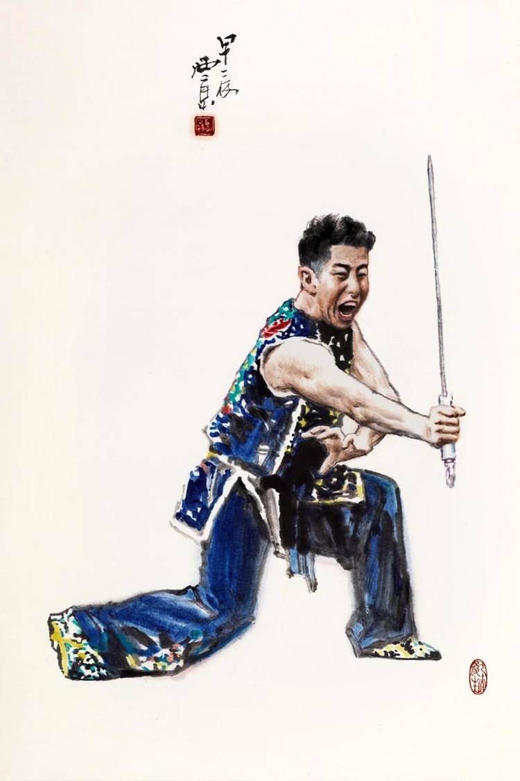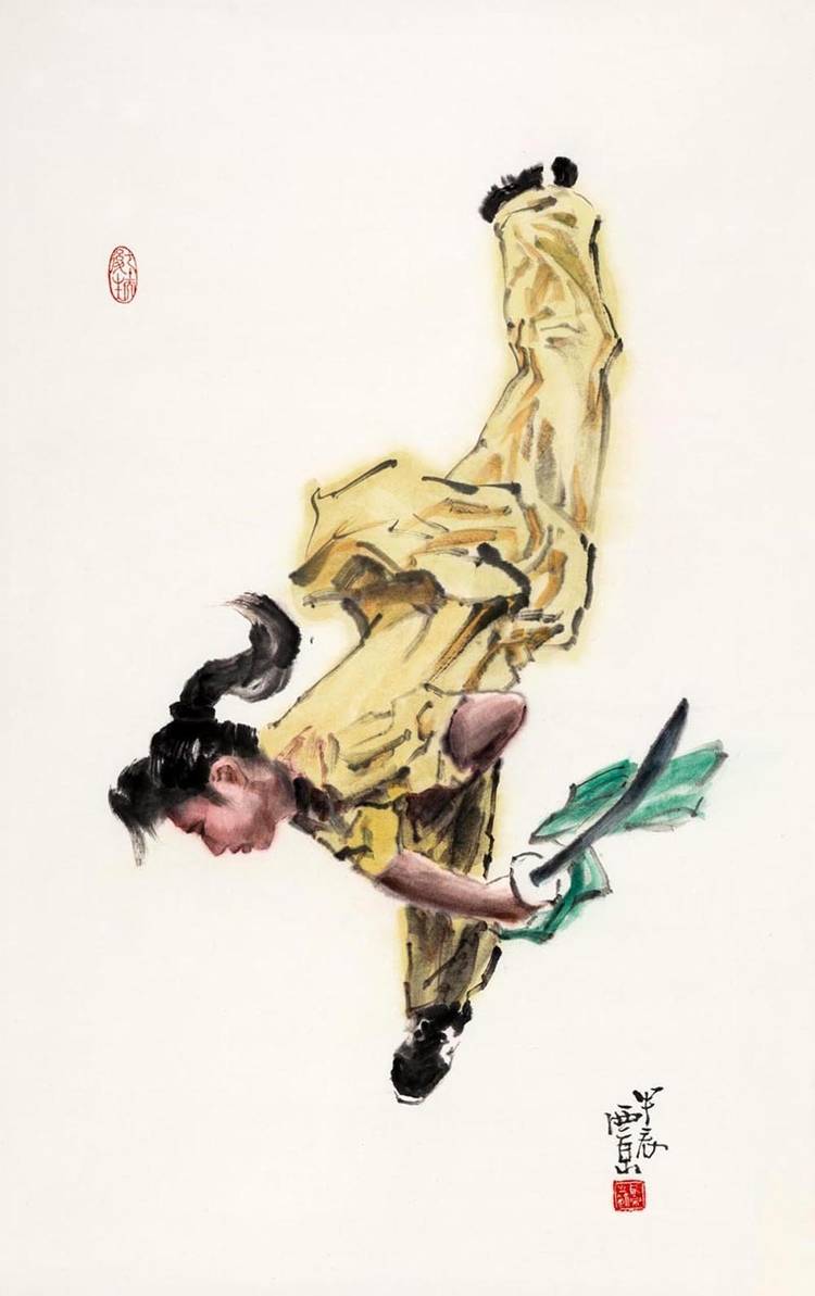 王西京的武林人物画将中华武魂挥洒得气吞山河。他用中国画诠释了武术精要,展现了岳飞、武松、穆桂英等英雄的身影,以及崆峒派、武当派、少林派、峨眉派、咏春派、太极拳等武术流派的精彩瞬间。太极拳的圆转如意、以柔克刚,少林拳的刚猛劲道、威震八方,在他的画笔下幻化为极具冲击力的线条与墨韵组合。他运用没骨画法,让人们在水墨营造的氤氲光影中体会武术的动静、刚柔之美。这不仅是对武术美学的再提升,更重要的是提振了匡扶正义的民族血性,重振了“精忠报国”的家国情怀。这些画作仿若携带着中华武术精神的文化信鸽,漂洋过海,飞遍全球,成为世界认识中国文化的亮丽名片。