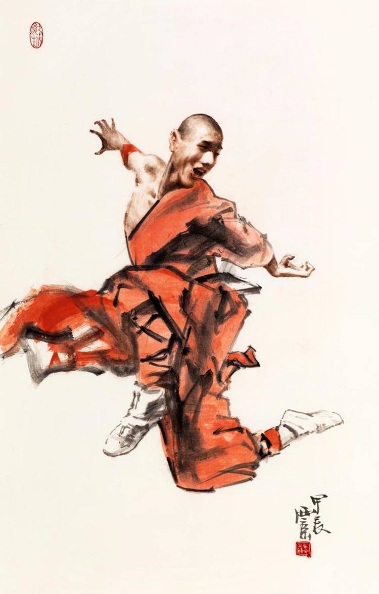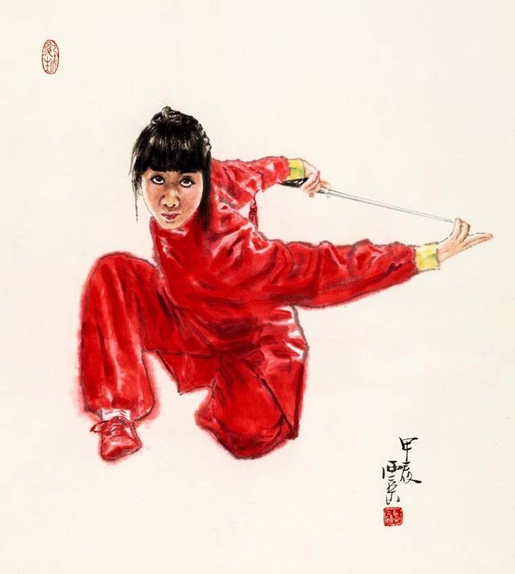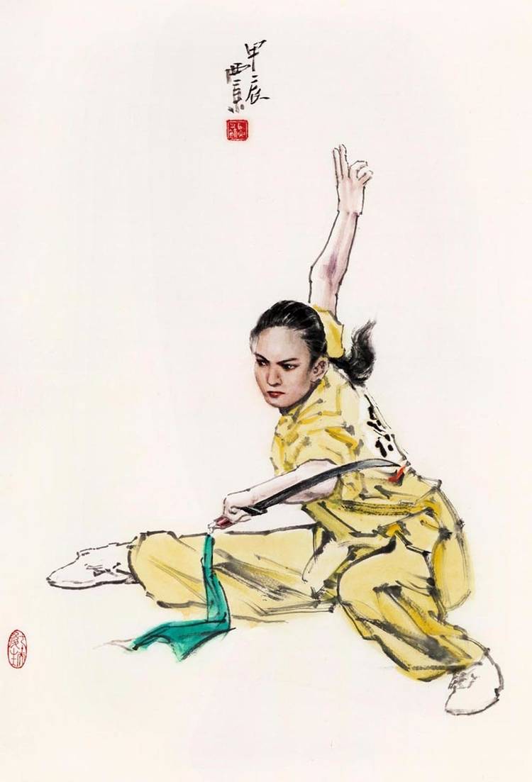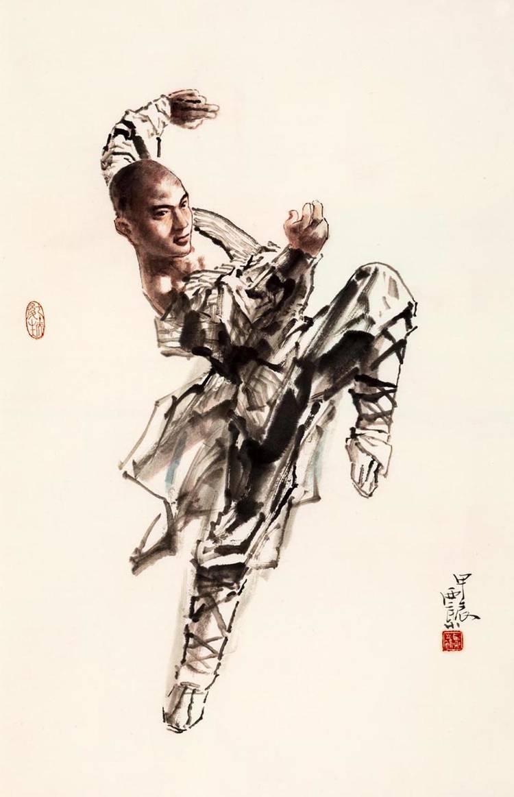 王西京的武林人物画将中华武魂挥洒得气吞山河。他用中国画诠释了武术精要,展现了岳飞、武松、穆桂英等英雄的身影,以及崆峒派、武当派、少林派、峨眉派、咏春派、太极拳等武术流派的精彩瞬间。太极拳的圆转如意、以柔克刚,少林拳的刚猛劲道、威震八方,在他的画笔下幻化为极具冲击力的线条与墨韵组合。他运用没骨画法,让人们在水墨营造的氤氲光影中体会武术的动静、刚柔之美。这不仅是对武术美学的再提升,更重要的是提振了匡扶正义的民族血性,重振了“精忠报国”的家国情怀。这些画作仿若携带着中华武术精神的文化信鸽,漂洋过海,飞遍全球,成为世界认识中国文化的亮丽名片。