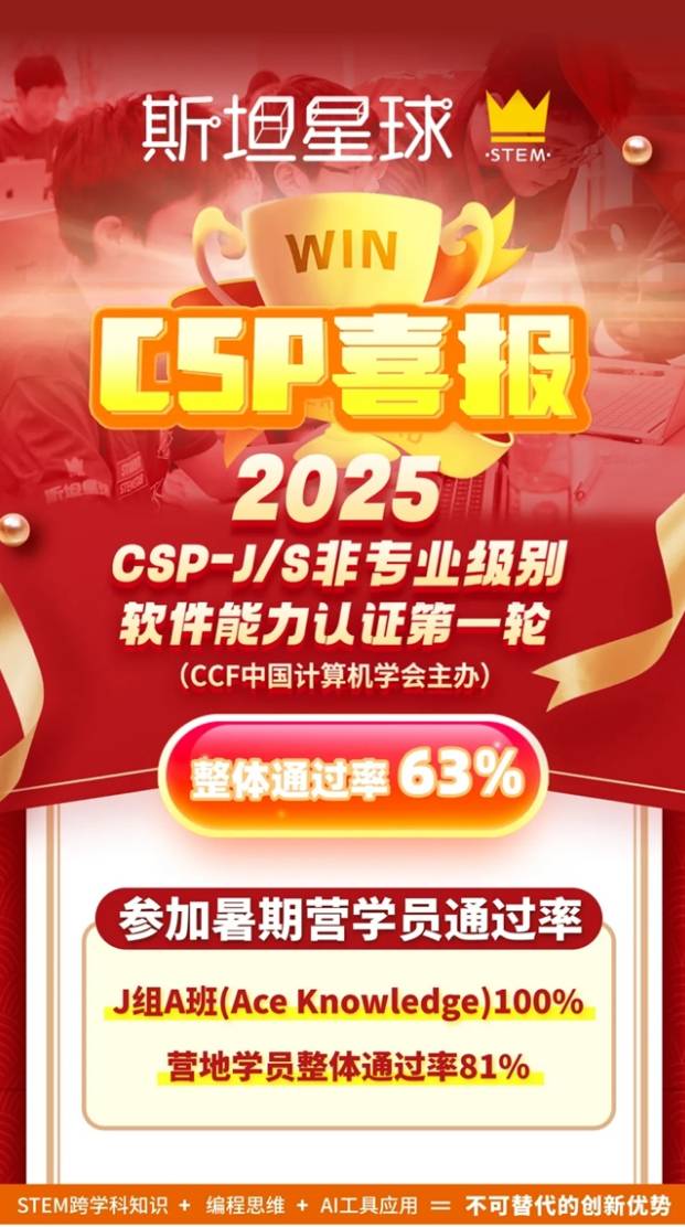 • 2025年CSP-J/S首轮认证:整体通过率63%,暑期营J组A班通过率100%、暑期营整体通过率81%