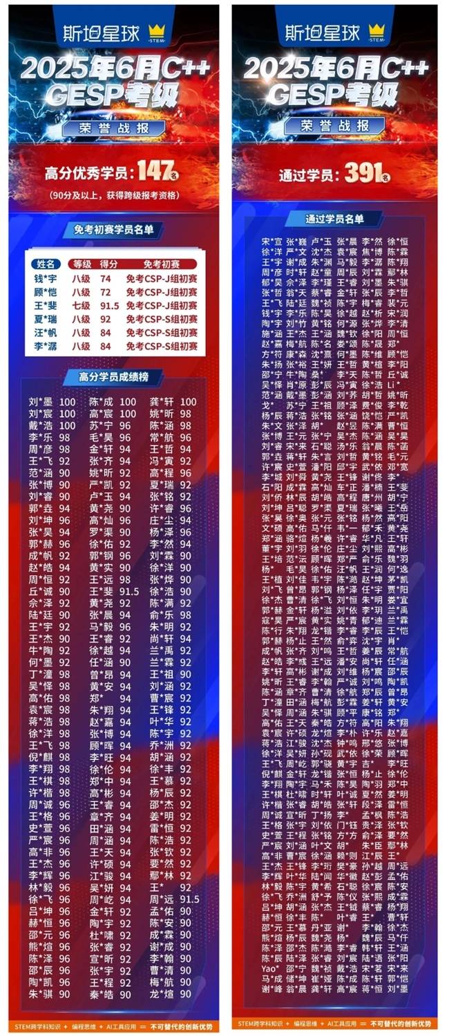 •2025年6月GESP等级认证:391名学员通过认证,147人获90分及以上“优秀”评级,6名学员获CSP-J/S组初赛免考资格