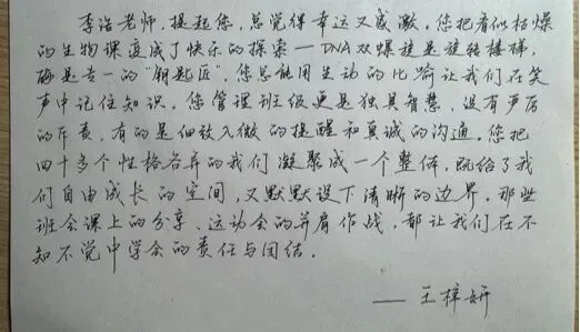 李浩老师,提起您,总觉得幸运又感激。您把看似枯燥的生物课变成了快乐的探索——DNA双螺旋是旋转楼梯,酶是专一的“钥匙匠”,您总能用生动的比喻让我们在笑声中记住知识。您管理班级更是独具智慧,没有严厉的斥责,有的是幽默的提醒和真诚的沟通。您把四十多个性格各异的我们凝聚成一个集体,既给了我们自由成长的空间,又默默设下清晰的边界。