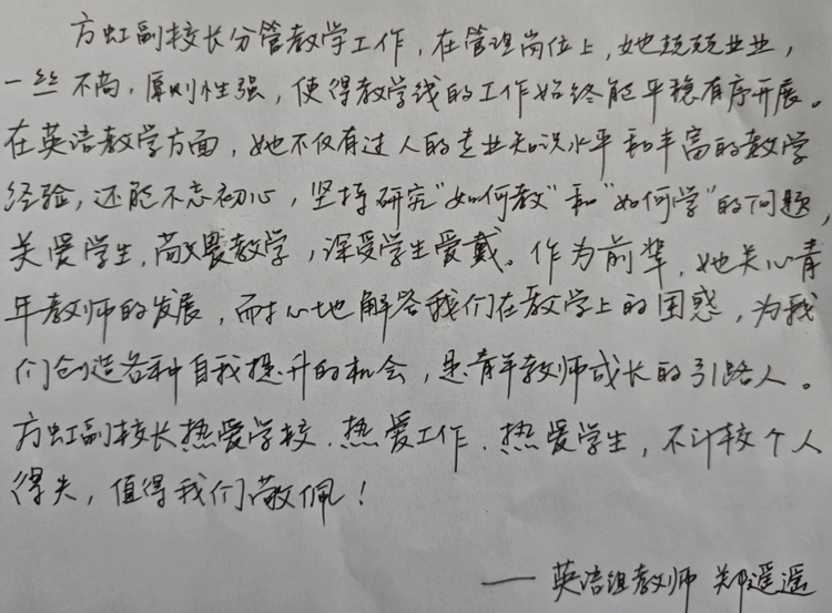 方虹副校长分管教学工作,在管理岗位上她兢兢业业,一丝不苟,原则性强,使得教学线的工作始终能平稳有序开展。在英语教学方面,她不仅有过人的专业知识水平和丰富的教学经验,还能不忘初心,坚持钻研“如何教”和“如何学”的问题,关爱学生,敬畏教学,深受学生爱戴。作为前辈,她关心青年教师的发展,耐心地解答我们在教学上面的困惑,为我们创造各种自我提升的机会,是青年教师成长的引路人。方虹副校长热爱学校、热爱工作、热爱学生,不计较个人得失,值得我们敬佩。