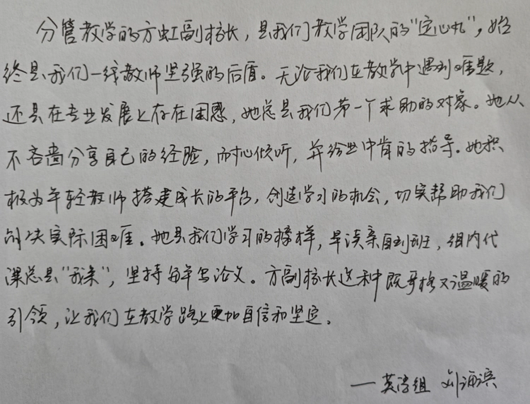 分管教学的方虹副校长,是我们教学团队的“定心丸”,她始终是我们一线教师最坚实的后盾。无论我们在教学中遇到难题,还是在专业发展上存在困惑,她总是我们第一个想到的求助对象。她从不吝啬分享自己的经验,耐心倾听,并总能给出中肯的指导。她积极为我们搭建成长的平台,创造学习机会,切实帮助我们解决实际困难。她是我们模仿的榜样,早读亲自到班,组内代课总是“我来”,坚持教科研。方副校长这种既严格又温暖的引领,让我们在教学路上走得更加自信、坚定!