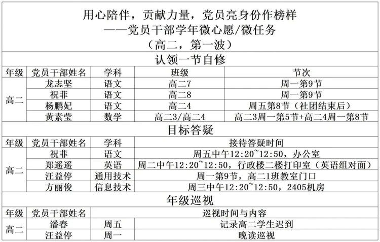 《中央八项规定》第一条也要求我们“切忌走过场、搞形式主义”,所以学校党总支结合“师生长伴”德育特色和“年级扁平化管理(培优补缺)”的教学实际,要求全体党员在这两项工作中切实起到先锋模范作用,并郑重作出以下两个承诺(党员学年微任务):