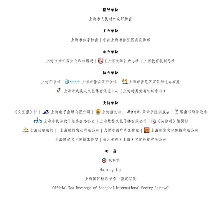 本届诗歌节的指导单位为上海市人民对外友好协会,主办单位为上海市作家协会和中共上海市徐汇区委宣传部。诗歌节将邀集国内外二十多位有影响的诗人,包括著名外国诗人何塞·路易斯·迪亚斯·格拉纳多斯(哥伦比亚)、克劳迪奥·波扎尼(意大利)、弗拉米尼亚·克鲁恰尼(意大利)、马蒂亚斯·波利蒂基(德国)、索尼娅·布雷斯勒(法国)、伊丽莎·鲁埃达(西班牙)、马可·索佐尼(意大利)、露西·英格里什(英国)、冯海城(马其顿)、马里奥·梅伦德斯(智利)、卡蒂察·库拉芙科娃(马其顿)、玛丽亚·戈麦斯·拉拉(哥伦比亚)、赵燕芬(新加坡),拉蒙·科特·巴拉伊瓦尔(哥伦比亚)。中国诗人有谢冕、胡弦、缪克构、梁晓明、张晓雪、王钦刚、高秀芹、崖丽娟、阿依古丽、邹胜念等著名诗人、翻译家和文学评论家。本届诗歌节将举办丰富多彩的诗歌朗诵、交流和文学研讨,邀请文学、文化、教育等社会各界人士和热爱文学的市民共同参与。
