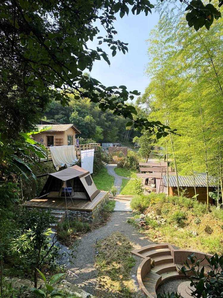在虎峰山清幽山谷中,寺下山隐民宿保留原始夯土老墙的建筑,住客可晨起漫步古道,在古今对话中感受时光厚度;界外民宿坐拥群山,怀抱翠竹,在最大程度保留民房原貌的基础上建成虎峰山上唯一一家美术馆民宿;半山小隐民宿整体为新中式风格,7间客房沿着长廊延伸以“隐”命名,共同构成“四下无趣不如闲”的妙义;阑珊文创小院四周竹林环抱,院内纯手工器物、鲜花雅器、书法作品、土墙茅草和现代家居混搭,星空下的住宿露营帐篷更是别具一格。