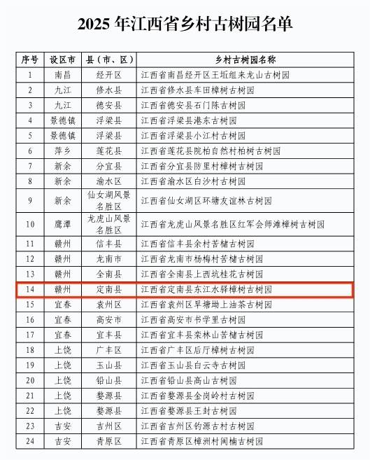近日,江西省林业局公布2025年省级乡村古树园名单,定南县龙塘镇洪洲村东江水驿樟树古树园成功创建并获评省级乡村古树园,成为定南县乡村生态保护与文化传承的闪亮名片。这项荣誉的获得,是对当地古树资源保护工作的高度认可。