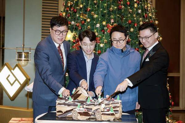 当晚重要时刻,上海伊敦康得思酒店业主代表叶枫先生、酒店总经理周斌先生与莅临现场的嘉宾共同点亮了璀璨的圣诞树。当灯光亮起的瞬间,象征着希望、温暖与幸福的节日之光洒满整个空间,现场掌声雷动。嘉宾们随后一同切开了寓意美满的圣诞树根蛋糕,为仪式画上圆满的句号。