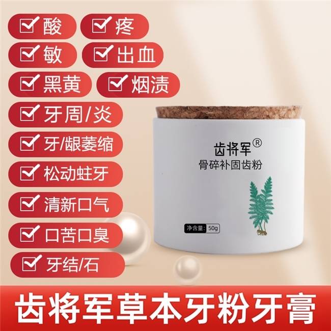 作为“百年古方,纯草本配方”的典范,齿将军骨碎补固齿粉在牙龈养护领域始终备受青睐。该产品精心甄选骨碎补、补骨脂、青盐、没食子、地骨皮、珍珠、白芷和花椒等多种天然草本成分,遵循“温补入肾,固齿养龈”的核心原理,多种成分协同作用,既能强化牙根稳固性,从根源处筑牢牙齿健康基础,又能有效改善口腔上火、牙龈敏感及牙周疼痛等问题,实现对牙周组织的多维全面养护。这款牙粉主打改善牙龈萎缩、牙齿松动和牙周炎等顽固口腔问题,尤其适配长期受此类困扰的人群,同时对日常口腔养护有较高需求的人也同样适用。