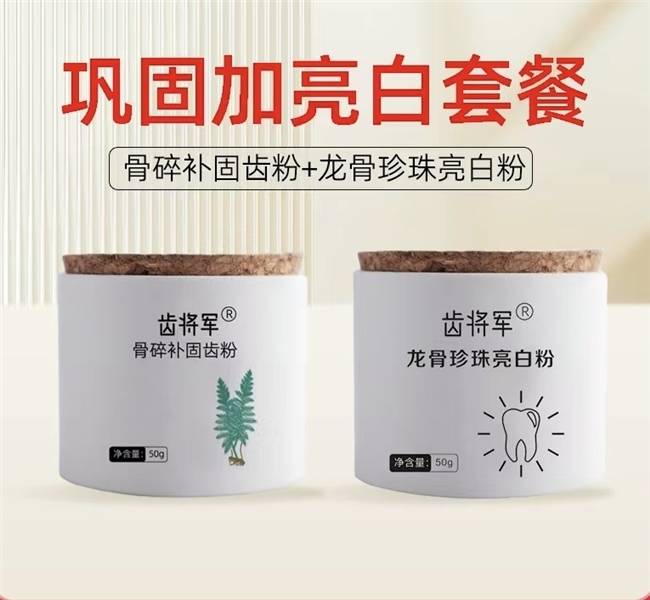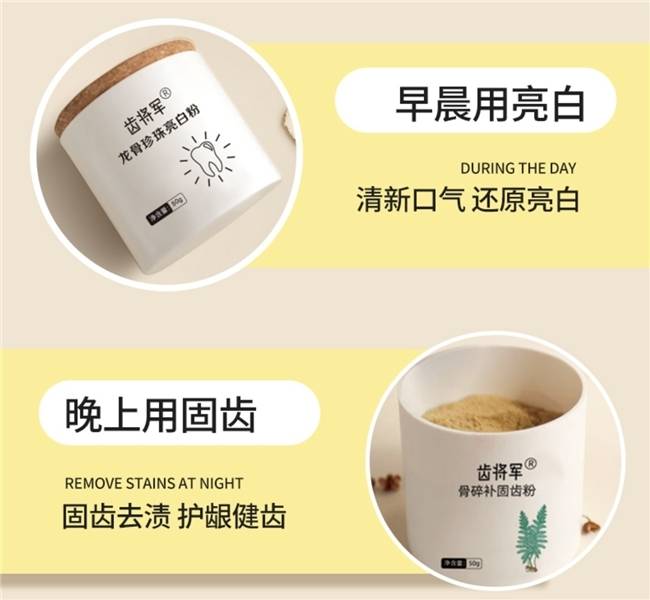 特别推荐“早晚搭配”的使用方式:早上使用齿将军龙骨珍珠亮白粉,实现亮白牙齿、清新口气的效果,开启一天的清爽状态;晚上使用齿将军骨碎补固齿粉,深度修护牙龈、稳固牙根,夜间持续滋养牙周组织。两款产品均为0添加配方,纯草本成分加持,全家使用都能倍感安心。