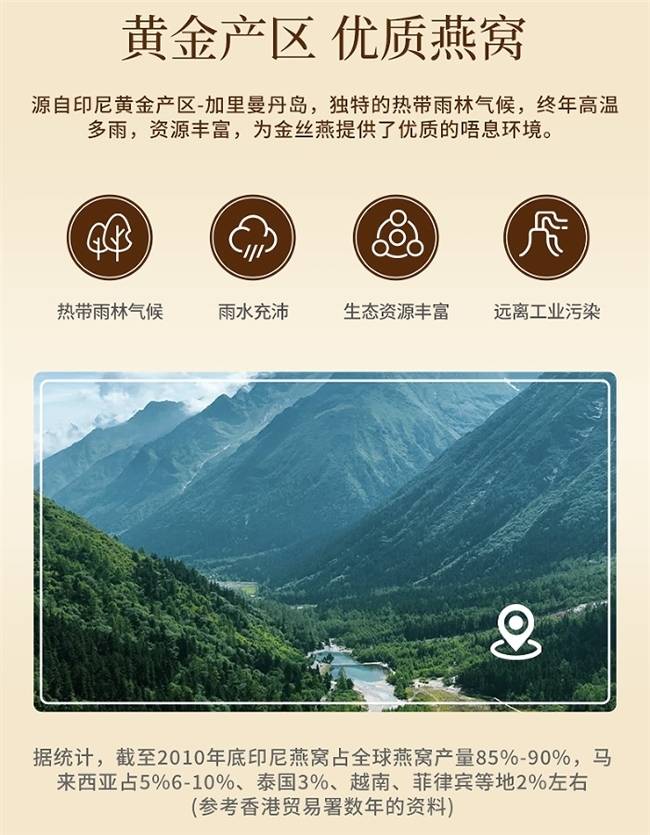 从源头来看,它选自印尼加里曼丹岛,被誉为“黄金产区”,这里热带雨林气候与全年高温多雨的生态,使金丝燕能衔来最纯净的空气与水分。产地的优良基因带来了独有的燕丝粗长和白度——一眼望过去,晶莹如晨雾。生态资源丰富,远离工业杂质,每一盏都像从自然里掏出来的宝物。