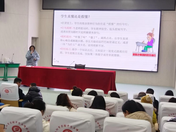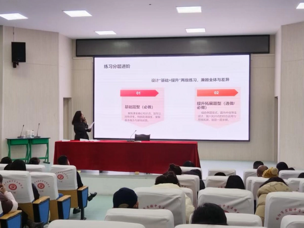 王佩老师针对数学学科提出了“立足学情,分层提升”的整体思路,“磨刀不误砍柴工”,教师上好课首先要备好课。因此,王老师指出备课需要精准掌握学生现状,找到教学的真实起点,她自己就是三维分层备课的。其次是布置作业要分层,设计必做基础题与选做提升拓展题,使作业成为学情的“反光镜”。最后是讲评升级,她建议老师们可以推行“类题讲评”,引导学生从“订正一道题”走向“掌握一类题”,重思维路径而非答案本身。
