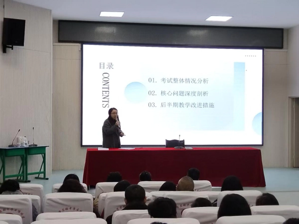 英语组王娇燕老师从半期的整体情况分析、核心问题深度剖析和后半期改进措施三个方面进行了汇报,主要聚焦在词汇语法基础薄弱、阅读理解能力不足等几个方面。英语组的老师们专门为此进行了集体研讨,制定了后半期的改进方向:一是强化语言积累,提升综合运用;二是注重方法指导,逐步缩小学生间的能力差距。