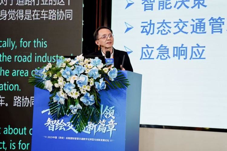 陕西省交通运输厅原厅长、陕西省公路学会理事长杨育生作为促进会发展的见证者,回顾了该平台自 2023 年筹建以来,在资源整合、技术创新、标准构建、“政产学研用” 协同等方面的不懈努力与丰硕成果。他强调,在百年变局与世纪疫情交织的复杂背景下,智慧交通已超越单纯技术范畴,成为以人为本、推动治理现代化、促进区域协同、增进民生福祉的系统性工程,并提出从构筑数字化底座、驱动治理智能化、营造产业新生态、拓展国际合作空间四个维度深化实践的建议。