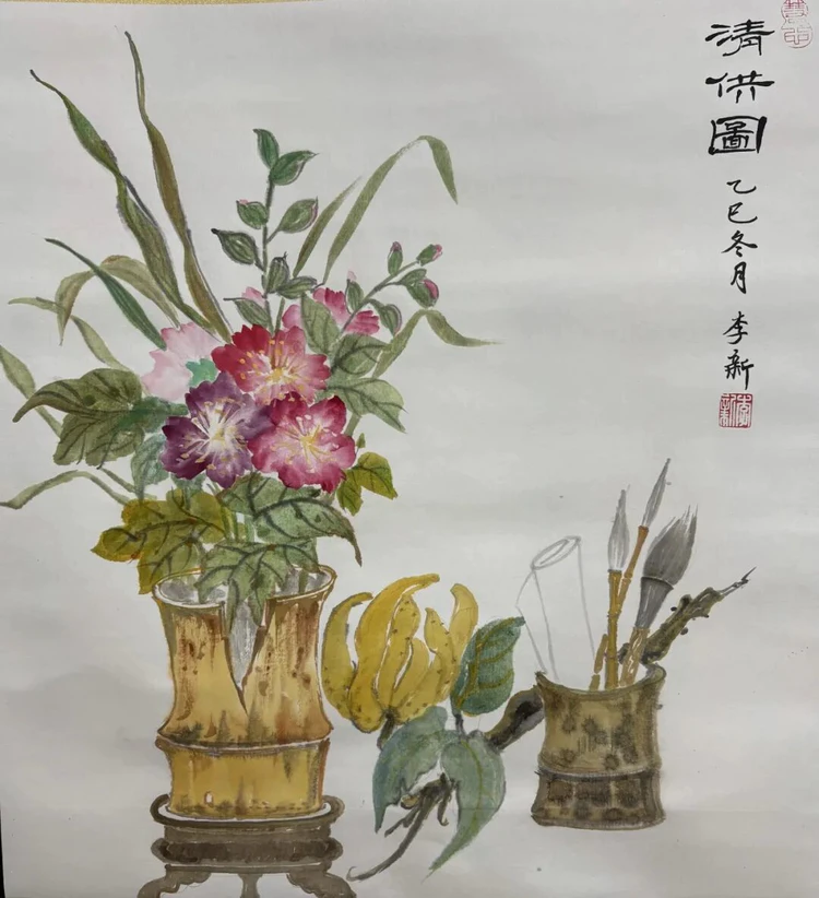 李新:女,属兔。活泼热情,写字画画时又安静的像"龟"。从事青少年美术教育40多年,多次被评为区、市级美术教育先进工作者。在退休后的10多年里积极加入所居住的街道、社区文化建设。在前辈老师们的推荐鼓励下,参与所巷社区《幸福学堂》教学,与友书画们坚持开展《全民终身学习周》、为居民新年写春联送福等多项公益活动。秉承着子承父业的精神,2019年加入杭州市《新四军历史研究会》与老父亲一同整理《新四军历史文献》。投入大量时间创作革命题材的书画作品,多次入围参展,并发表多篇书画创作体会,刊登在市级专题刊物中。