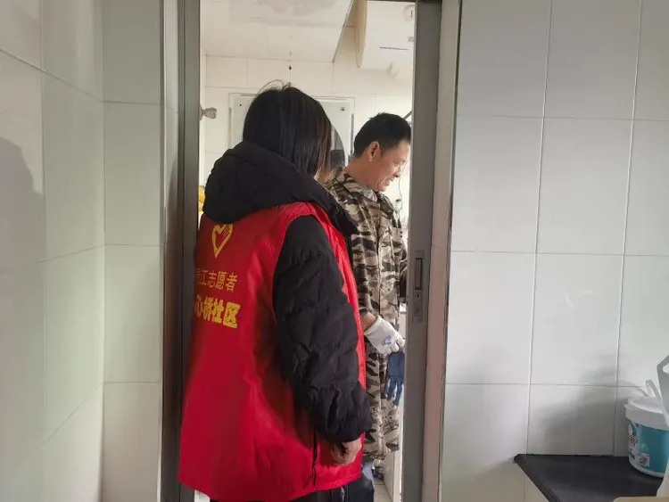 此前,四单元703室卫生间导轨门处突然出现漏水洞,污水渗漏不仅弄脏了室内地面,还波及楼下住户,原本和睦的邻里间渐生嫌隙。住户拨通社区服务热线后,工作人员第一时间登记诉求,次日便带着调解和服务方案上门。社区工作人员围站在四单元703室卫生间旁,一边耐心倾听双方诉求、梳理责任边界,用拉家常的方式缓和邻里情绪;另一边,身着“一心桥社区志愿者”红马甲的工作人员同步联系维修师傅,现场确认漏水点的破损情况。