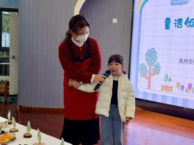 展示环节中,每个家庭轮流上台,分享作品背后的创作故事与营养巧思。孩子们用稚嫩的声音介绍自己的“童话饭宝”,家长们则在一旁温柔补充,讲述亲子协作中的点滴灵感与健康考量。糖糖小朋友和妈妈共同介绍了他们的作品《蔬菜公主》:“我们把孩子最爱的童话公主和蔬菜结合在一起——米饭捏成脸蛋、海苔做成睫毛、面条编成辫子。花环上的西蓝花、胡萝卜花、玉米宝石,都是孩子亲手搭配的。”妈妈特别分享道:“我们希望通过这个作品,让小朋友知道蔬菜也可以很有趣,从而爱上吃蔬菜!”