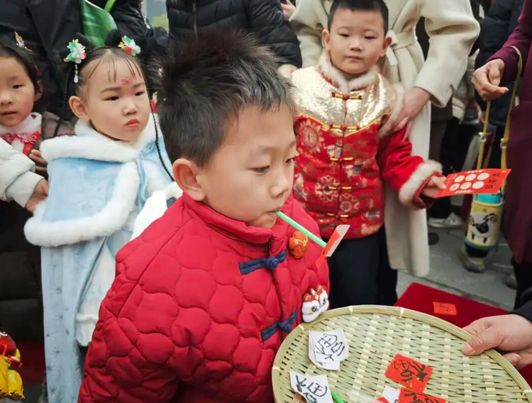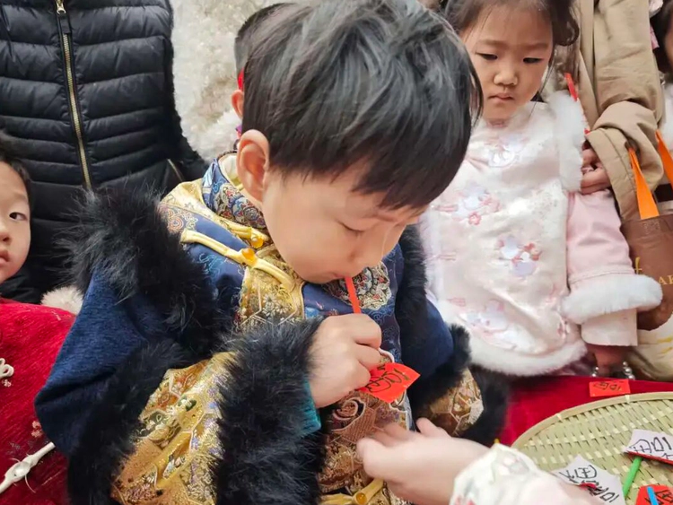 新年到,看,小一班的摊位上有趣的吸福体验正吸引着小朋友们,拿着吸管,将福字牢牢吸住,新的一年福气满满哦!